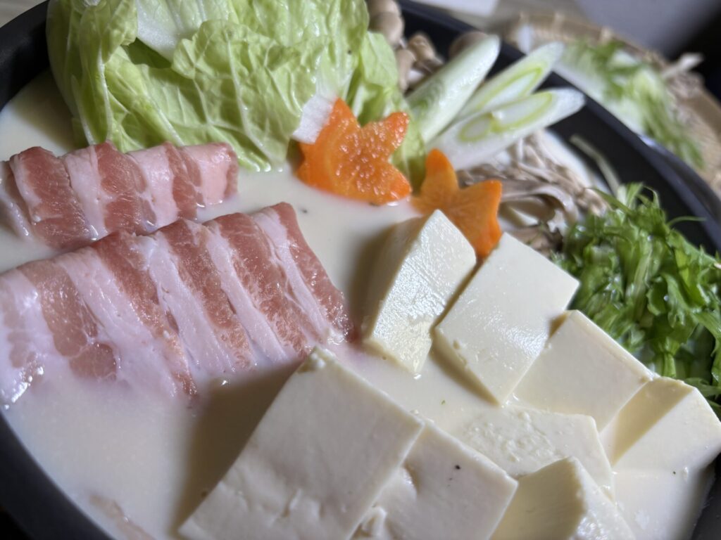 豆乳はご存知の通り栄養価の高い大豆たんぱく質を含む製品です。たんぱく質は、三大栄養素のひとつで、筋肉を作ったり免疫力を高めたりと、健康な体を維持するために必要です。 大豆イソフラボンや植物性たんぱく質は、豆乳や豆腐に多く含まれるため、豆乳鍋で効率良く摂取することができます。今回はめちゃくちゃ簡単なレシピでお届けします。塩分も抑えているので、遠慮なくスープまでいっちゃってください!