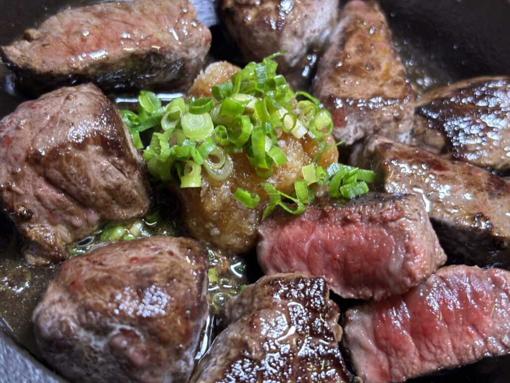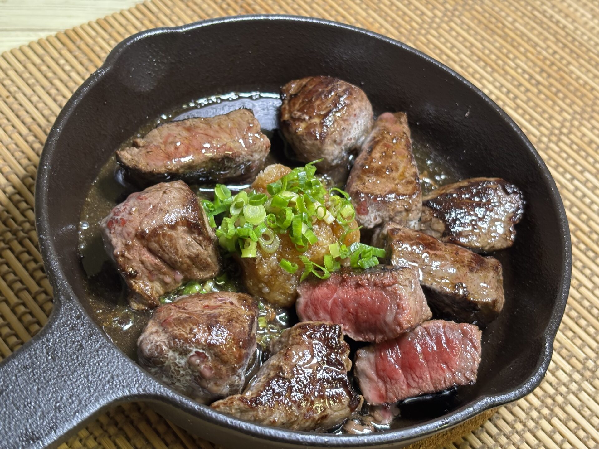 今回はそんなに難しい料理ではありません。買ってきた安いステーキ肉をぶつ切りにして、塩胡椒で味付けし、おろしと味ぽんでまとめただけのスキレット料理。これにいつもの缶チューハイでいい気持ちになりながら「さて、何を語ろうか」といったところ。「まかないが美味い!」なんて言われることが最近多々ありますので(ありがたい限りです)、調理をしていく上での極意というか重要ポイントを語るブログにしましょうか。ですので、知っている方や鉄鍋ステーキに興味のある方はレシピまで飛んでもらってOKです。