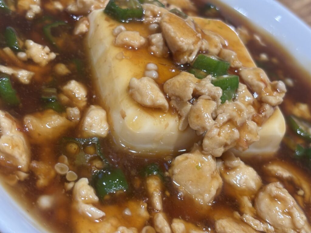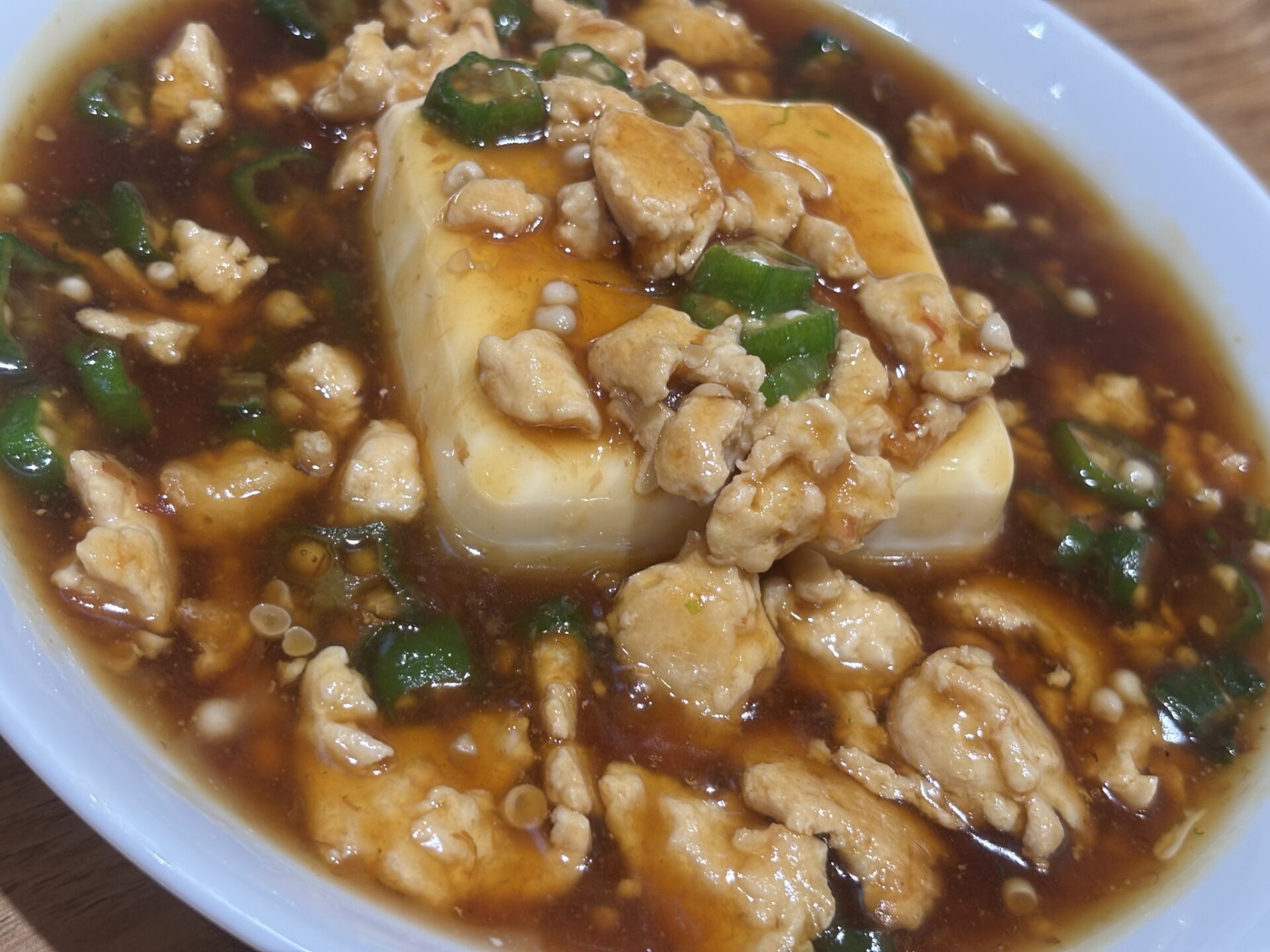 あっさりした鶏挽肉とオクラの食感。とろりとした生姜あんで豆腐が美味しい一品です。