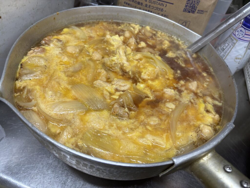 19時に食べる子もいれば21時をすぎて食べる子もいる。どの人にもトロトロの親子丼を食べて欲しいから、その都度2人前づつ卵を加えます。それがこのまかない「親子丼のこだわり」です。卵が先になくなりますから、つゆ多めで調整し、卵がなくなってきたら追加して親子煮に仕立てるというアイデアです。みんなが笑顔になるように「よし、頑張るぞ!」となるように。