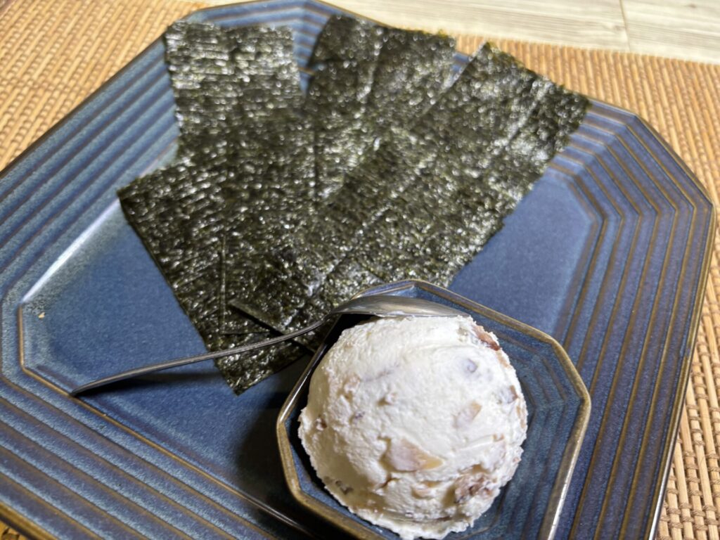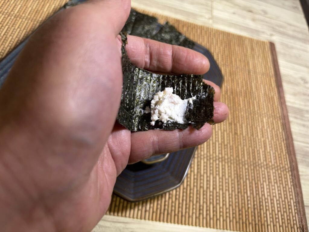 今回はご協力いただいた「本物志向/丸高海苔」様の「焼海苔」を使用させていただきましたが、普通の板のり、味付けのり、韓国海苔でも美味しくお召し上がりいただけます。ただ、だし感が若干弱いのでいぶりがっことクリームチーズを「海苔で食べている」感覚になるかと思います。