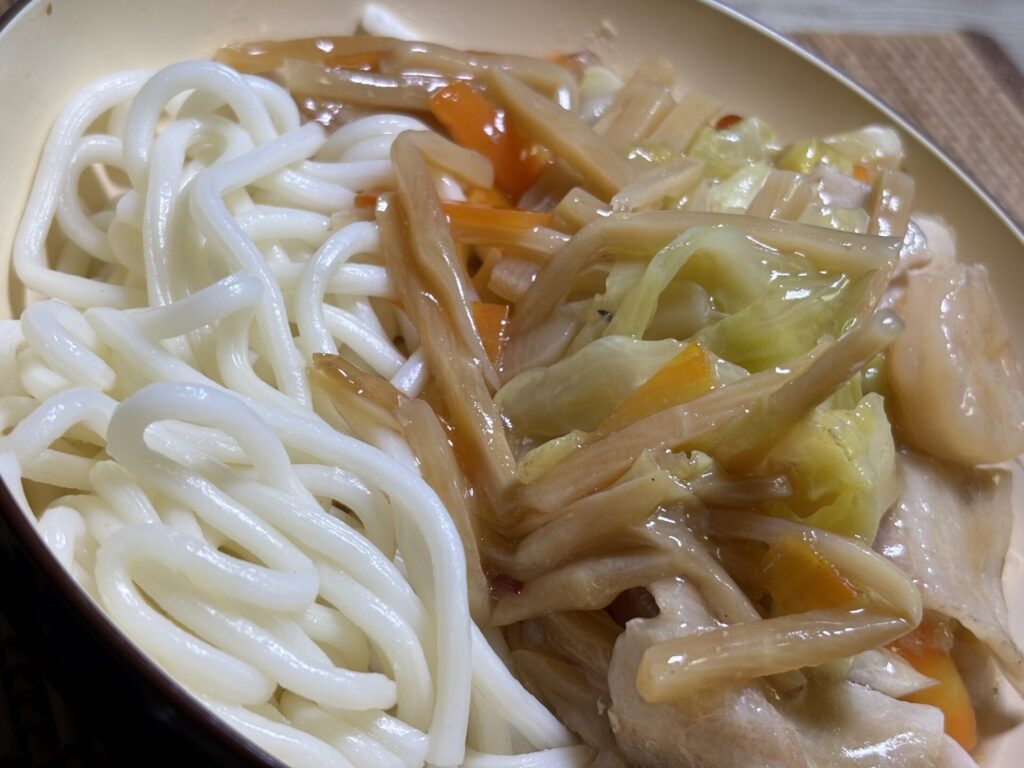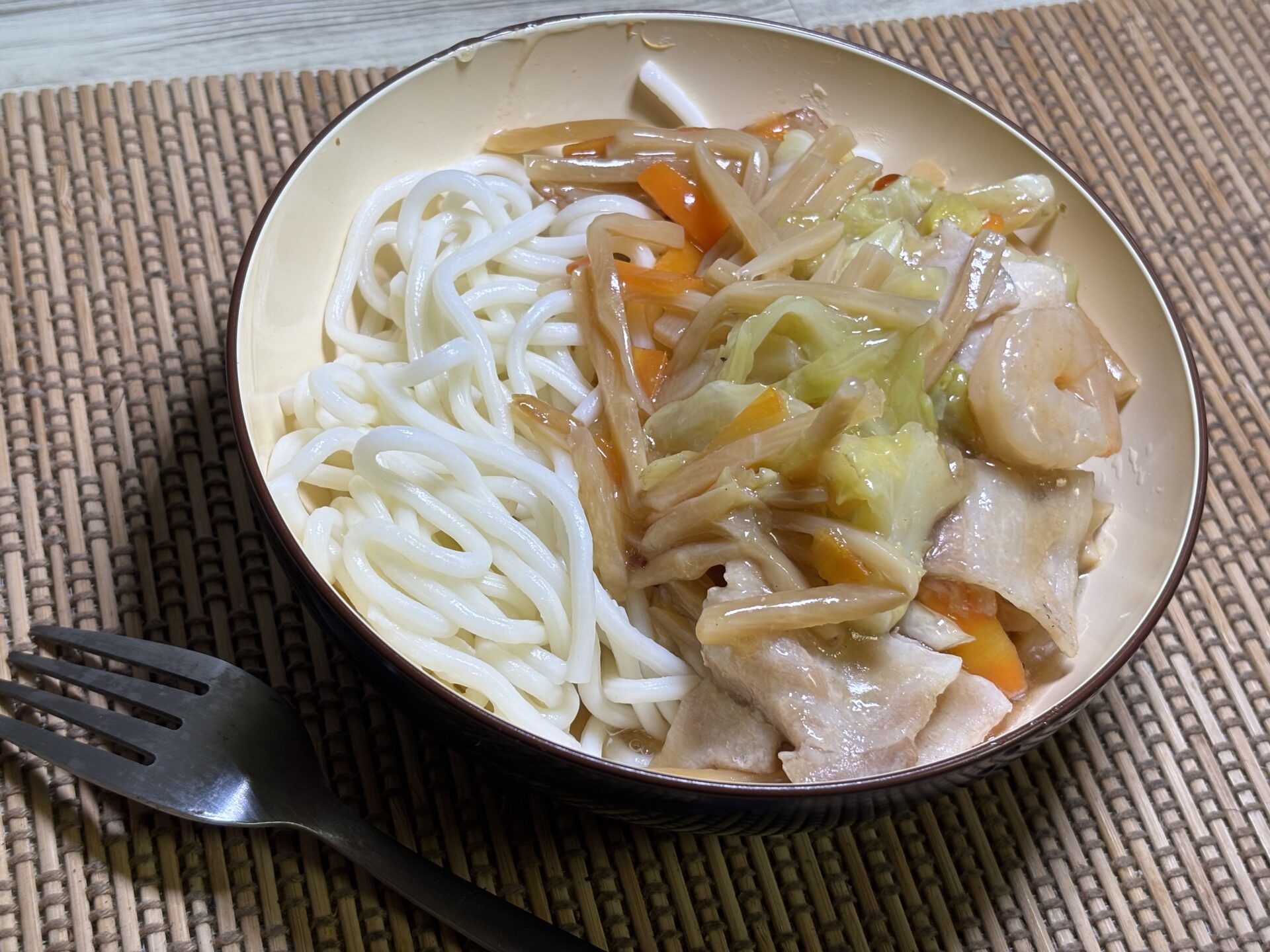 レシピは故郷愛知県の公益財団法人春日井市食育推進給食会様レシピを参考に調整させていただきました。時間を置いても麺とよく絡むあんかけ。子供の頃に必要な栄養素を過不足なく備えた構成。しかも、大人も子供も大好きな麺類。よく考えられた給食だったと思います。大人になってから「コシがコシが〜」とか「もっちり感が〜」とか言っている方は、これを食べた経験があるから言えることだと思います。